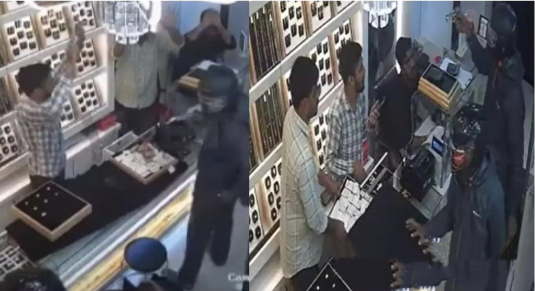 റെയിൻകോട്ടും ഹെൽമറ്റും ധരിച്ചാണ് മൂവർ സംഘവം രാത്രി ജ്വല്ലറിയിലേക്ക് എത്തുന്നത്. ഉടനെ തോക്ക് ചൂണ്ടി ജീവനക്കാരെ പരിഭ്രാന്തരാക്കി. അപായ സൈറൻ മുഴക്കാൻ ജീവനക്കാരിൽ ഒരാൾ ശ്രമിച്ചതോടെ വെടിയുതിർത്തു. അഞ്ച് റൗണ്ട് വെടിയുതിർത്ത പ്രതികൾ കൗണ്ടറിലുണ്ടായിരുന്ന പണവും ഷെൽഫിലെ സ്വർണവും കൈക്കലാക്കി.