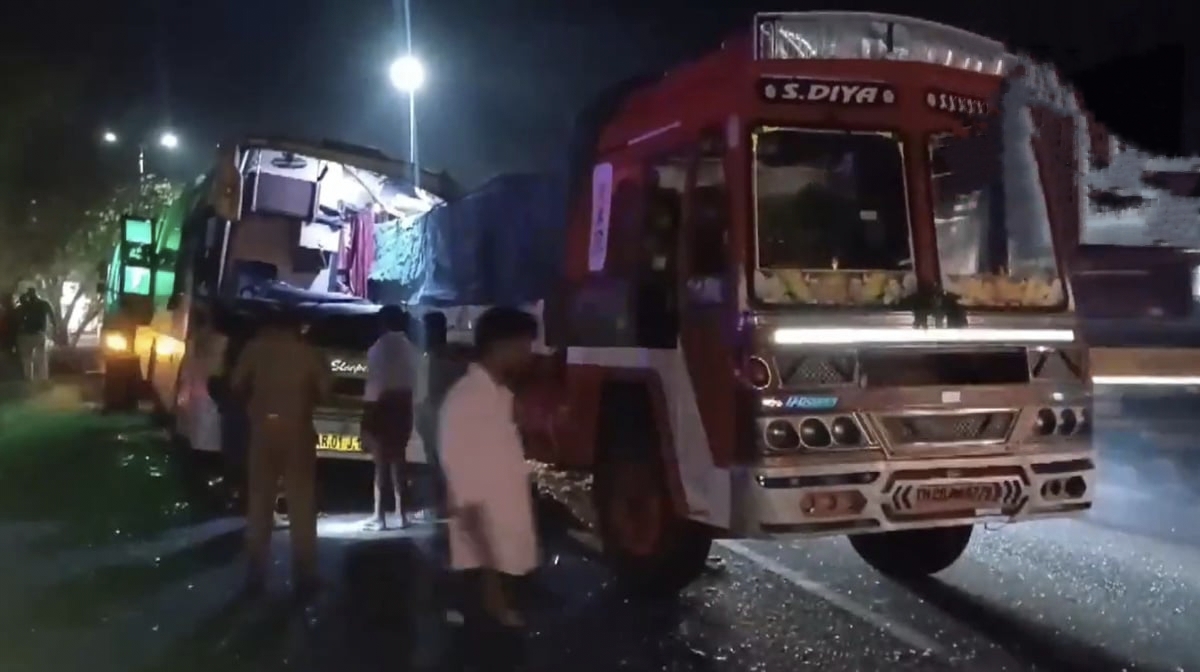 കരിങ്കല്ലുമായി പോയ ലോറിയെ ബസ് ഓവർടേക്ക് ചെയ്യുന്നതിനിടെ നിയന്ത്രണം വിട്ടതാണ് അപകട കാരണം. ഇതിന് പിന്നിലേക്ക് മറ്റൊരു ബസ് കൂടി ഇടിച്ചു കയറുകയായിരുന്നു. അപകടത്തിൽ പരിക്കേറ്റവരെ ചെങ്കല്ലുപേട്ടു ഗവ. ആശുപത്രിയിൽ പ്രവേശിപ്പിച്ചു.