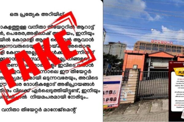 എറണാകുളം : സിനിമ റിവ്യൂവേഴ്സിനും ഓൺലൈൻ മീഡിയയ്ക്കും വിലക്കേർപ്പെടുത്തിയെന്ന തരത്തിൽ പ്രചരിക്കുന്ന നോട്ടീസ് വ്യാജമെന്ന് വനിത തിയേറ്റർ. വനിതാ തിയേറ്റർ മാനേജ്മെന്റ് പുറത്തിറക്കിയ പ്രത്യേക അറിയിപ്പ് എന്ന പേരിലാണ് സോഷ്യൽ മീഡിയയിൽ വ്യാജ അറിയിപ്പ് പ്രചരിക്കുന്നത്. സോഷ്യൽ മീഡിയയിൽ പ്രചരിക്കുന്ന വ്യാജമാണെന്നും അതുമായി തിയേറ്ററിന് ബന്ധമില്ലെന്നും വനിത തിയേറ്റർ അറിയിച്ചു. എല്ലാവിധ ഔദ്യോഗിക അറിയിപ്പുകളും ഔദ്യോഗിക സോഷ്യൽ മീഡിയ വഴി നടത്തുന്നതായിരിക്കുമെന്ന് തിയേറ്റർ വ്യക്തമാക്കി. എല്ലാ സിനിമ പ്രേമികൾക്കും തിയേറ്ററിലേക്ക് സ്വാഗതമെന്നും എല്ലാവർക്കും സുഖപ്രദമായ തീയേറ്റർ…